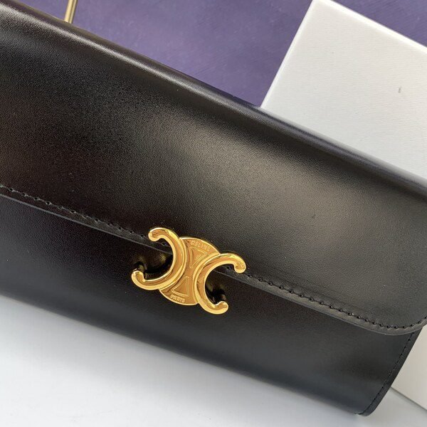 Celine Bags 120 Style No. C10E313 Black, TRIOMPHE Metallic Snap Button, Zipper Bag, 2 Gusset Compartments, 1 Flat Pocket, 12 Card Slots. Size 19CM-10CM