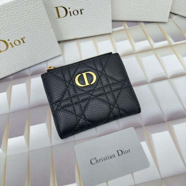 This compact accessory features a zippered compartment and card slots for easy carrying and can be paired with other Dior Caro pieces.