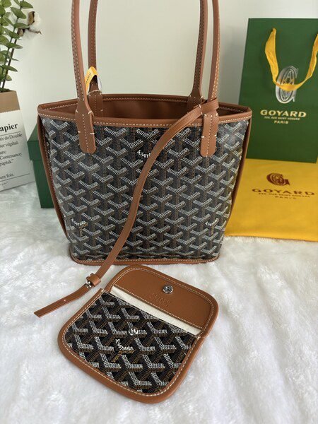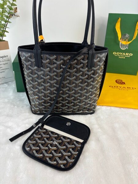 Goyard Bags 165 Goyard Bag is leather version of iconic Saint Louis bag, with Goyardine canvas lining.It offers two different aesthetic styles.Its gradually thickened handle provides a good grip comfortable feel.The compact and small form factor makes Anjou Mini perfect for nighttime use or carrying some daily essentials during the day. Style number: 98196 Color: Black/Brown Size: 9cm x 19.5cm