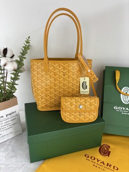 Goyard Bags 165 Goyard Bag is leather version of iconic Saint Louis bag, with Goyardine canvas lining.It offers two different aesthetic styles.Its gradually thickened handle provides a good grip comfortable feel.The compact and small form factor makes Anjou Mini perfect for nighttime use or carrying some daily essentials during the day. Style number: 98196 Color: Yellow Size: 9cm x 19.5cm