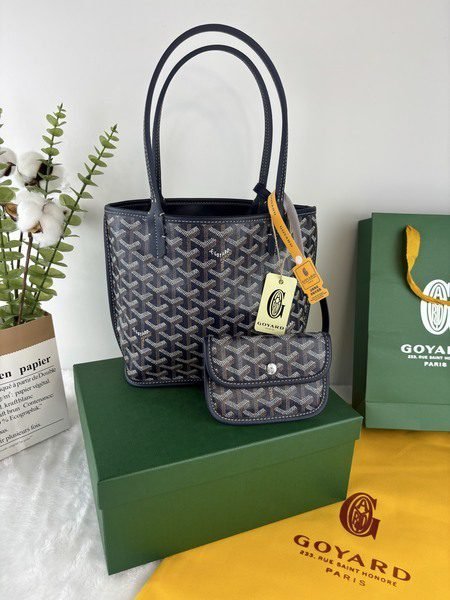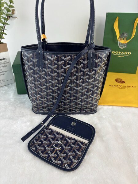 Goyard Bags 165 Goyard Bag is leather version of iconic Saint Louis bag, with Goyardine canvas lining.It offers two different aesthetic styles.Its gradually thickened handle provides a good grip comfortable feel.The compact and small form factor makes Anjou Mini perfect for nighttime use or carrying some daily essentials during the day. Style number: 98196 Color: Dark Blue Size: 9cm x 19.5cm