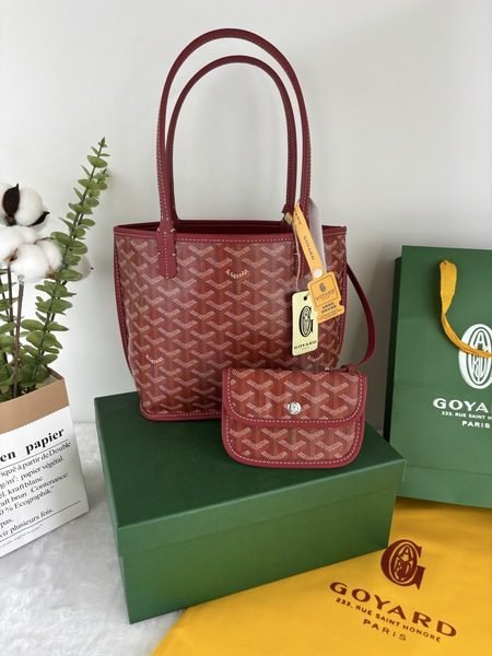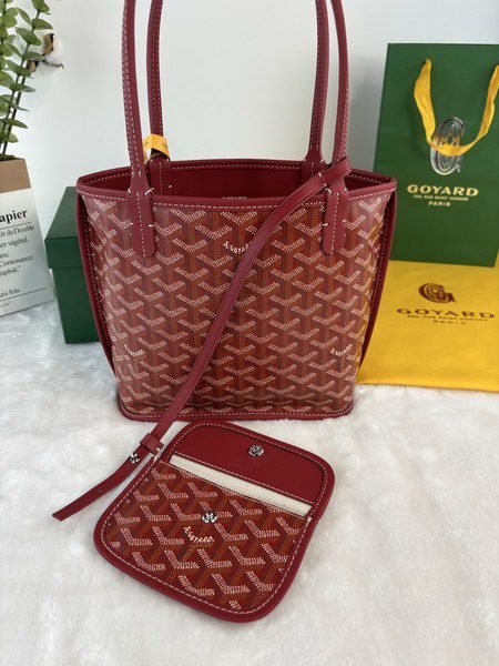Goyard Bags 165 Goyard Bag is leather version of iconic Saint Louis bag, with Goyardine canvas lining.It offers two different aesthetic styles.Its gradually thickened handle provides a good grip comfortable feel.The compact and small form factor makes Anjou Mini perfect for nighttime use or carrying some daily essentials during the day. Style number: 98196 Color: Red Size: 9cm x 19.5cm