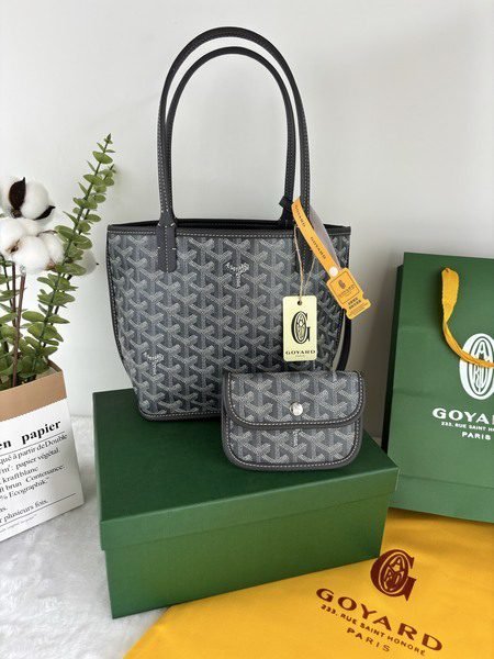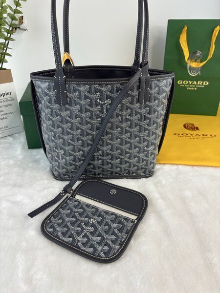 Goyard Bags 165 Goyard Bag is leather version of iconic Saint Louis bag, with Goyardine canvas lining.It offers two different aesthetic styles.Its gradually thickened handle provides a good grip comfortable feel.The compact and small form factor makes Anjou Mini perfect for nighttime use or carrying some daily essentials during the day. Style number: 98196 Color: Gray Size: 9cm x 19.5cm