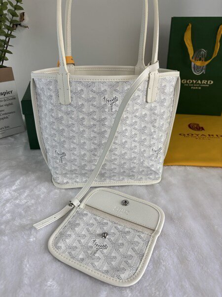 Goyard Bags 165 Goyard Bag is leather version of iconic Saint Louis bag, with Goyardine canvas lining.It offers two different aesthetic styles.Its gradually thickened handle provides a good grip comfortable feel.The compact and small form factor makes Anjou Mini perfect for nighttime use or carrying some daily essentials during the day. Style number: 98196 Color: White Size: 9cm x 19.5cm