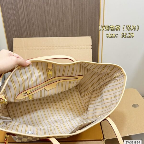 Chip-print version of the classic LV Neverfull tote bag: a fresh interpretation of the iconic handbag, explore the exquisite details inside.