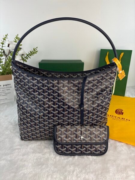 Goyard Bags 180 Goya Bohème Hobo bag epitome of lightness, flexibility, and security, thanks zipper closure.Due to its wide handle, it is very comfortable as shoulder bag.It also features the iconic detachable pouch that can be closed with a snap button. Style number: 98666 Color: Dark Blue Dimensions: 43cm 14cm x 27cm