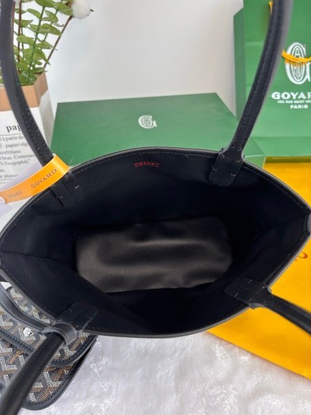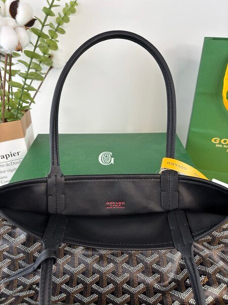 Goyard Bags 165 Goyard Bag is leather version of iconic Saint Louis bag, with Goyardine canvas lining.It offers two different aesthetic styles.Its gradually thickened handle provides a good grip comfortable feel.The compact and small form factor makes Anjou Mini perfect for nighttime use or carrying some daily essentials during the day. Style number: 98196 Color: Black Size: 9cm x 19.5cm