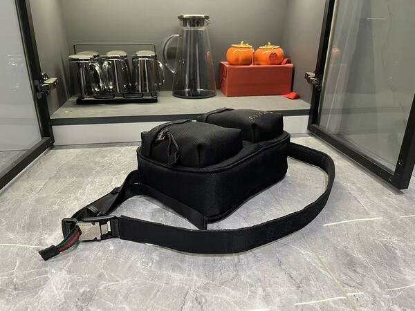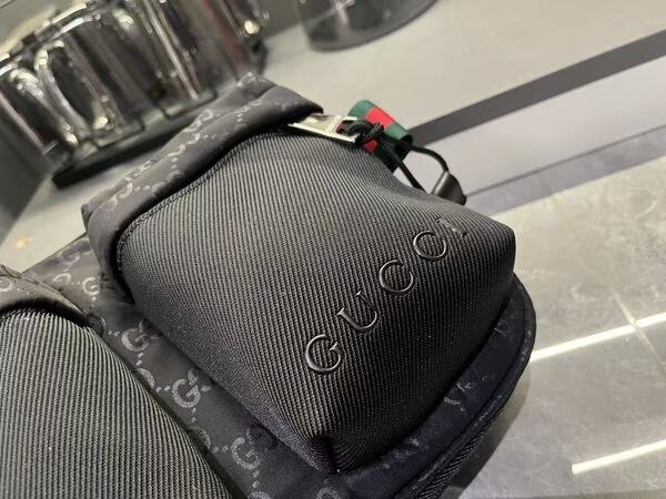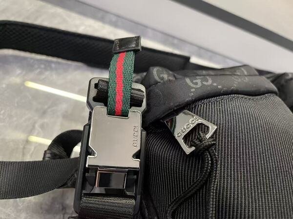 Black GG nylon with red and green webbing details, matching GG logo, black nylon lining.